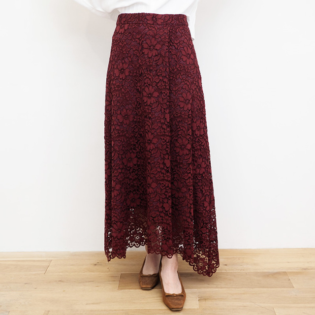 オリバーサットの人気アイテムフラワーレースイレギュラーヘム フレアースカートです。 昨年も大好評の贅沢にレースを使用したフレアースカート。 左側の裾がイレギュラーにやや長くなっているので、 動きが感じられ綺麗めにもカジュアルにもコーディネートしていただけます。 ご要望にお応えして、今シーズンはトレンド感溢れるアプト別注カラーで5色展開。 トレンドのブラウン系やボルドーカラー、ネイビー グリーンなど、主役としても脇役としても活躍間違いなしです。 多色買いのお客様が続出の人気アイテムですので是非早めにご検討ください。