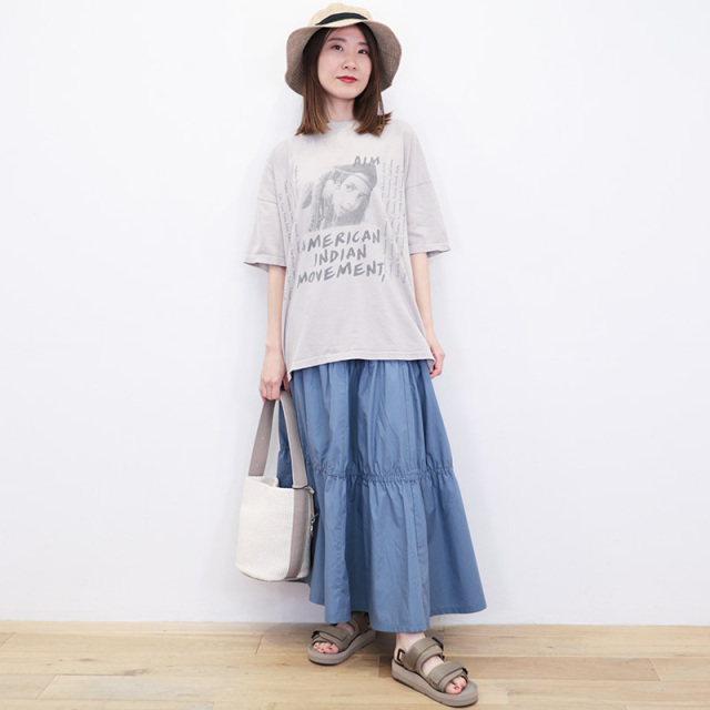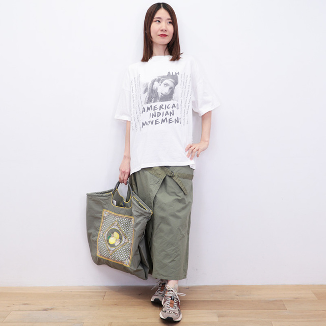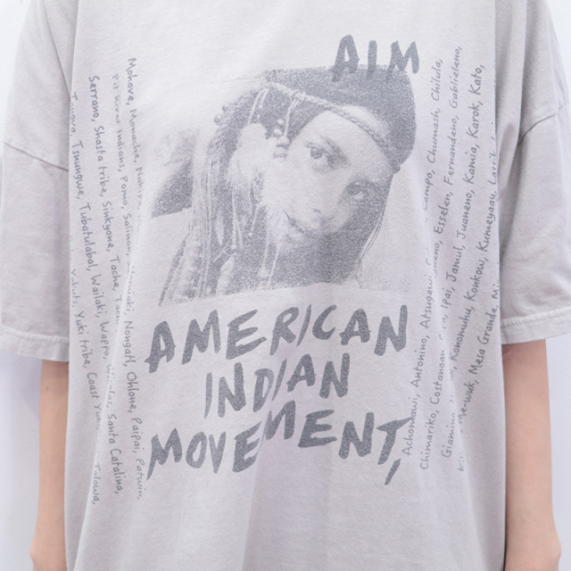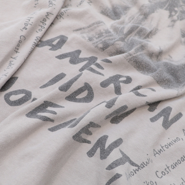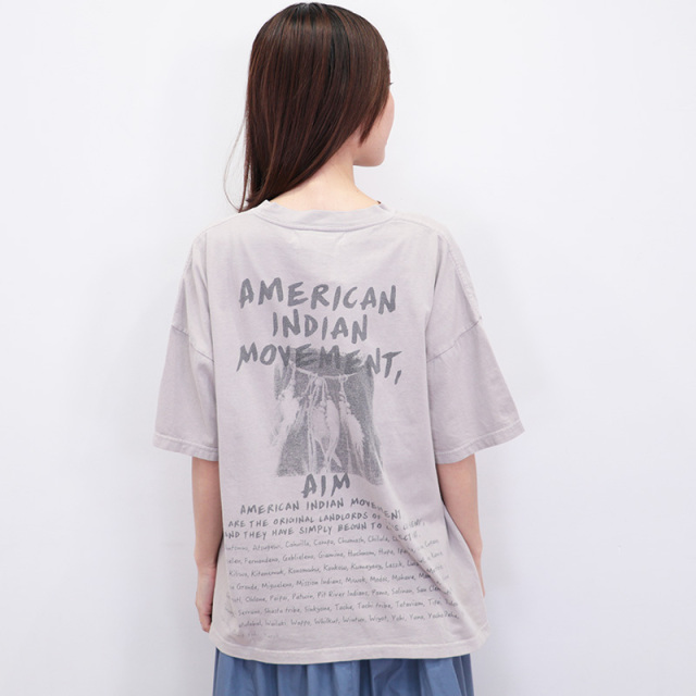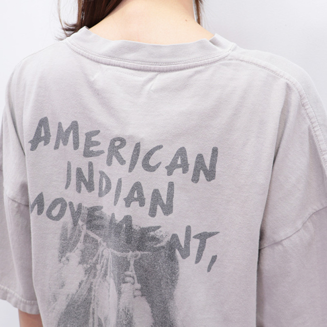 ビンテージのようなクタッとした質感がポイントのTシャツ。SP加工により、初めて着用した時から長年愛用していたようなこなれた雰囲気で様々なスタイリングにマッチする大人のTシャツです。手積みしたオーガニックコットン生地を使用。ややあまく編むことで、程良い厚みで、通気性もよく、ストレッチ性も出しています。フロントにもバックにも大きくプリントがあり、一枚で様になるロックTのようなデザイン。1968 年にミネソタ州ミネアポリスで設立されたネイティブアメリカンの公民権団体の、「アメリカインディアン運動」をモチーフにしています。