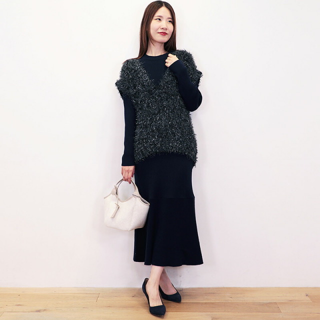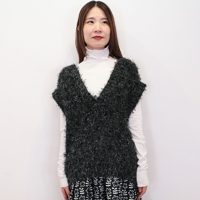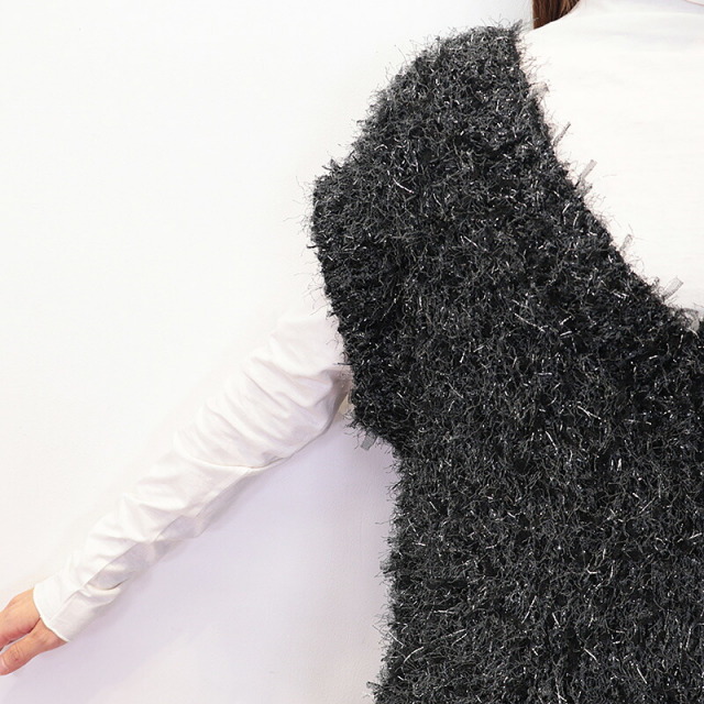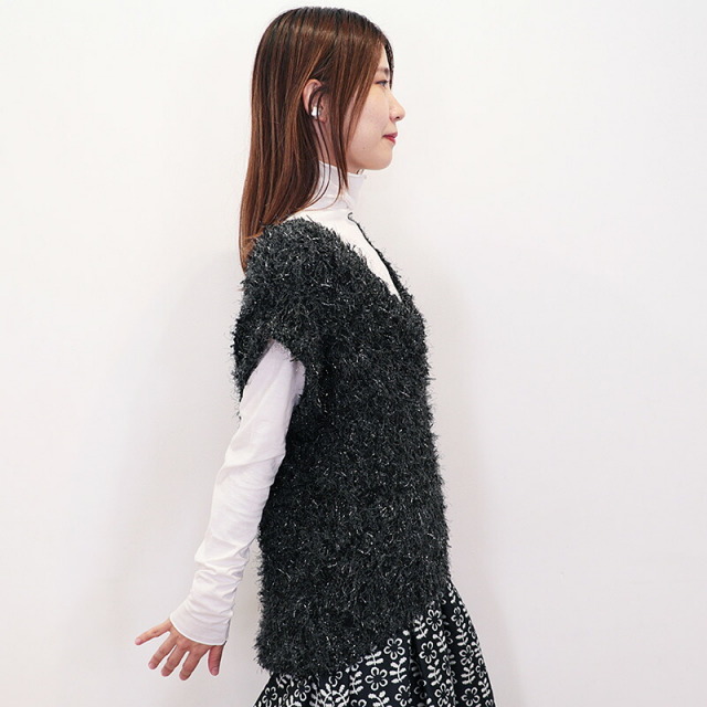 カラーミックスされた毛足の長いフェザーヤーンを使用したニットベスト。スッキリしたVネックとお尻の隠れる着丈で重ね着しやすいデザイン。中にスナップボタンがあり、袖の長さをアレンジいただけます。フェザーヤーンはリサイクル素材を使用。廃棄された衣類を生まれ変わらせ、より美しく新鮮に、扱いやすくアップデートしています。