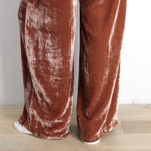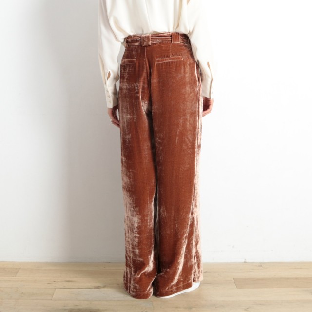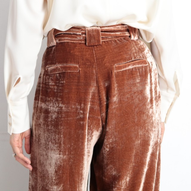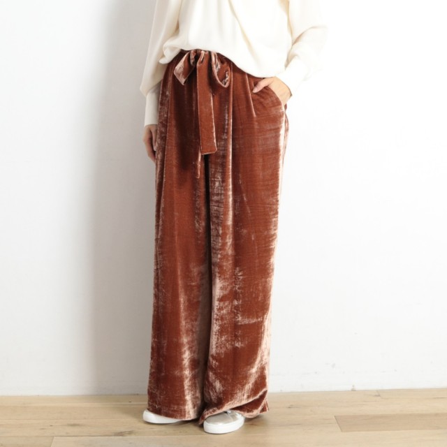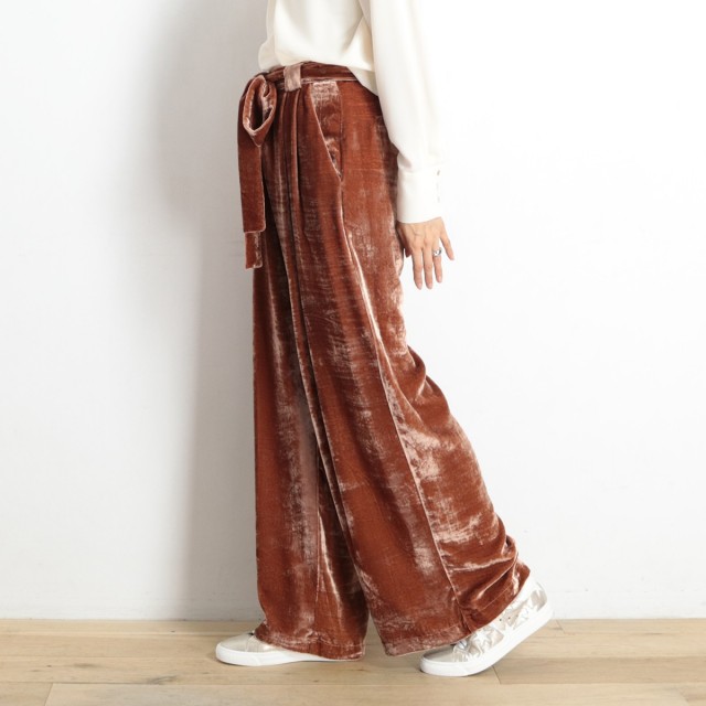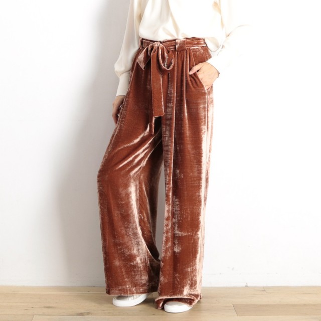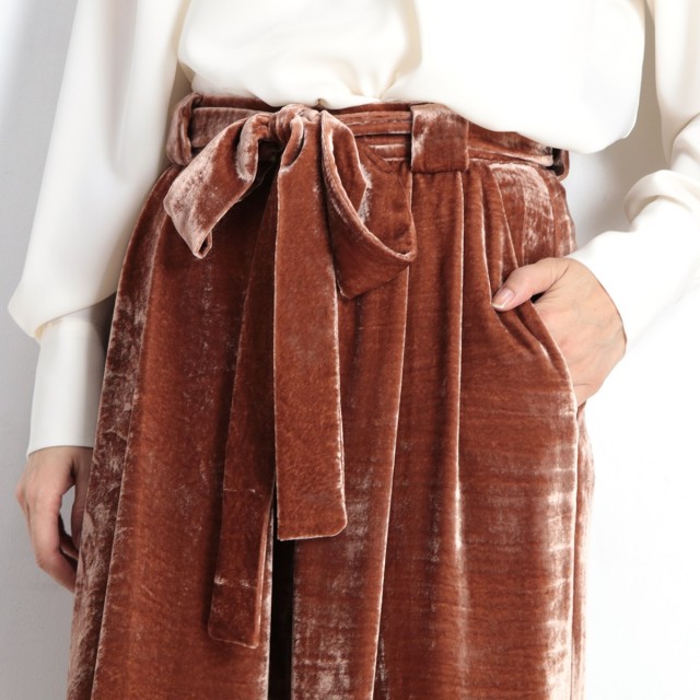 ヴィスコースのとろみ&艶感が美しいベロア素材を使ったトレンドライクな一着!ウエストには大人かわいい印象をプラスしてくれるウエストリボンを使っています。エレガントささとカジュアル感が上手く融合したオススメのアイテムです!カジュアルなプリントTeeやちょっと高めのヒールなどで組み合わせたり♪コーディネートに新しいエッセンスが加わりますよ♪