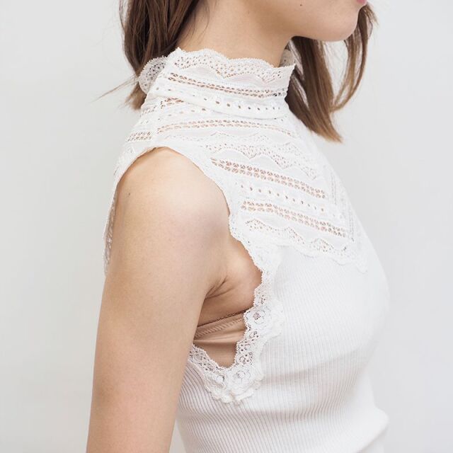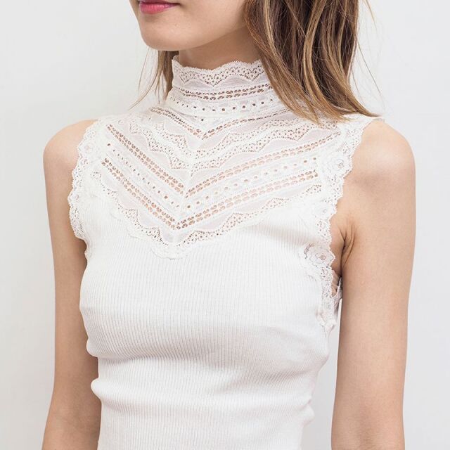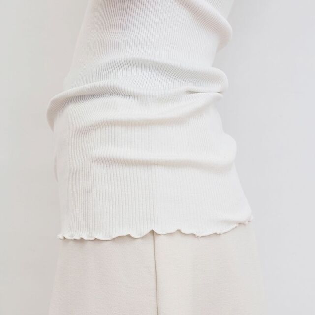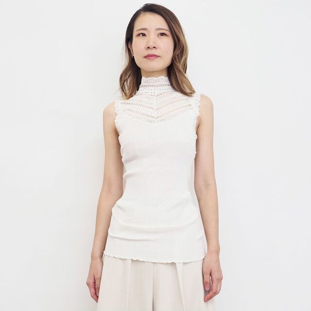 シルクとコットンの心地よい素材。とても滑らかな肌触りで、肌の呼吸を妨げず体温を調節し、冬は暖かく夏は涼しく快適に過ごすことができます。脇に縫い合わせのない筒状のホールガーメント仕様で、どんな体系にもフィットし重ね着に最適です。エレガントなレースのハイネックをのぞかせてブラウスの様に楽しむ着方もおすすめです。
