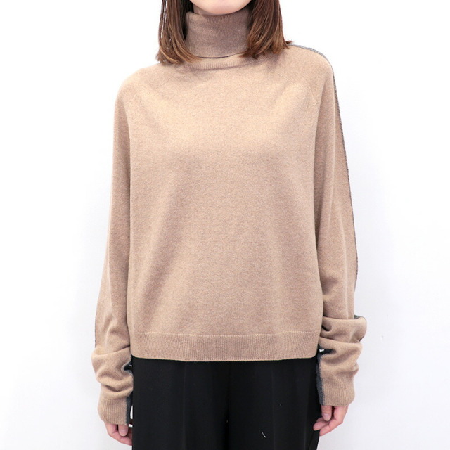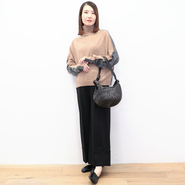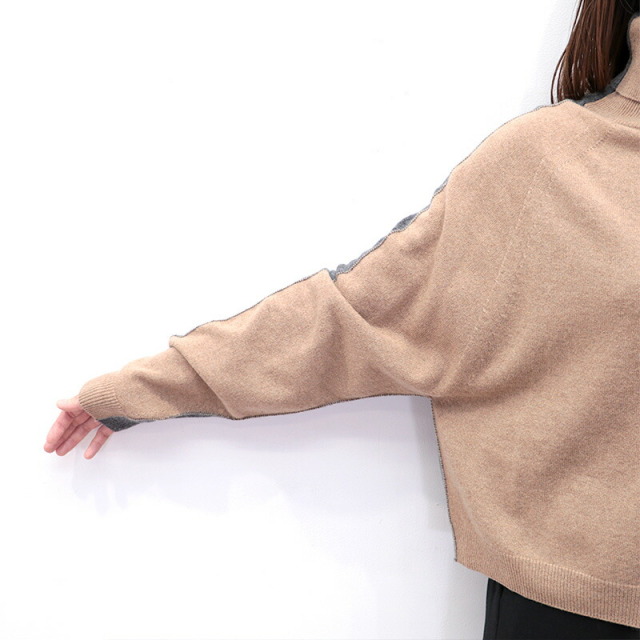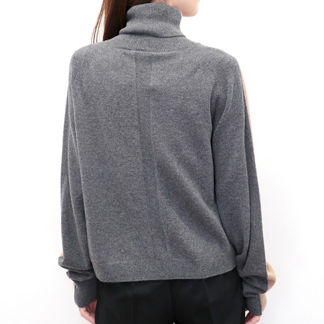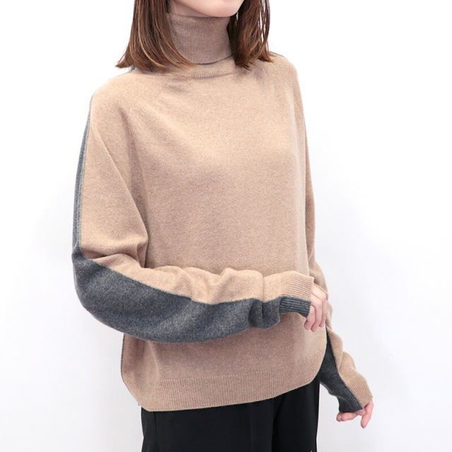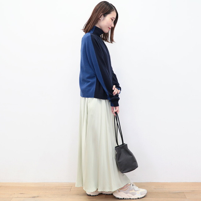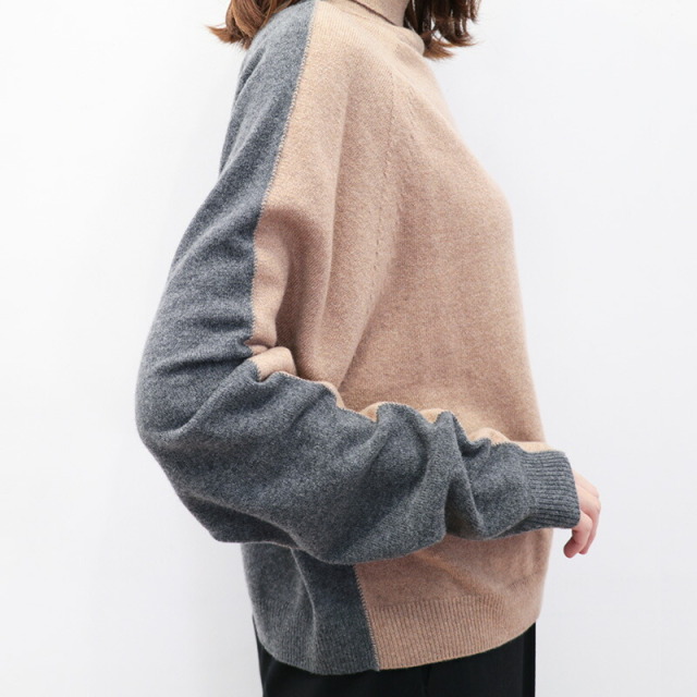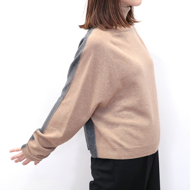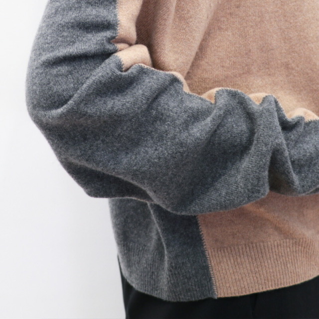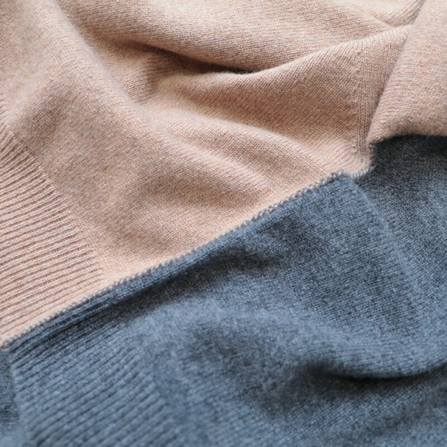 前後でカラーを切り替えた配色ニット。ベージュ×チャコールグレーの配色と、ネイビー×ロイヤルブルーの新鮮な組み合わせがイタリアらしい感性。単調にならず一着で着映えするデザインです。素材にはカシミヤを30%配合しており、肌当たりは滑らかで暖かく、着心地抜群。着ぶくれしない適度なボリューム感も着やすいポイントです。