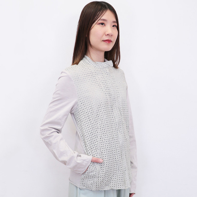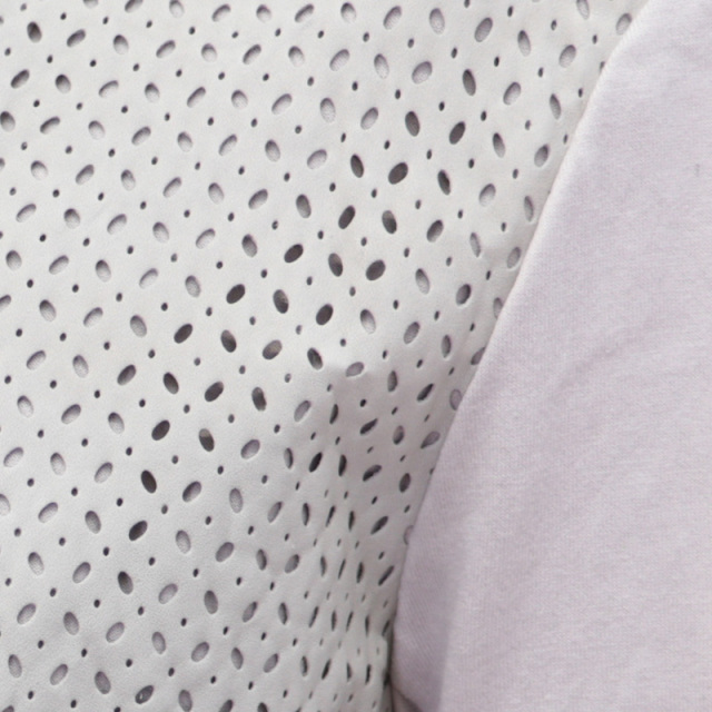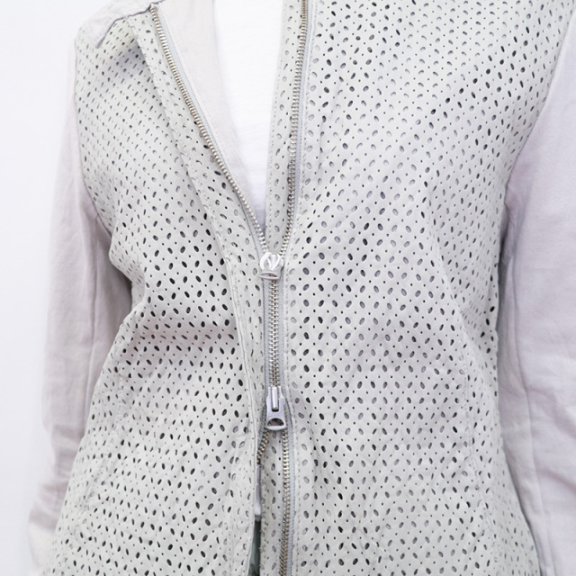 パンチングレザーと上質なコットンジャージーのコンビネーションモデル。レザーの持つエレガントな要素にパンチングが入ることで、上品でいてスポーティーな印象に。袖と後ろ身頃、裏地はコットン100%のジャージ素材で、軽く動きやすくノンストレス。カーディガンの様な感覚で楽しめるジャケットです。さらに、今シーズンはパンチング穴の形を特別セレクト。オリジナルよりも穴の面積が大きくなり、より軽快な印象と着心地になっています。