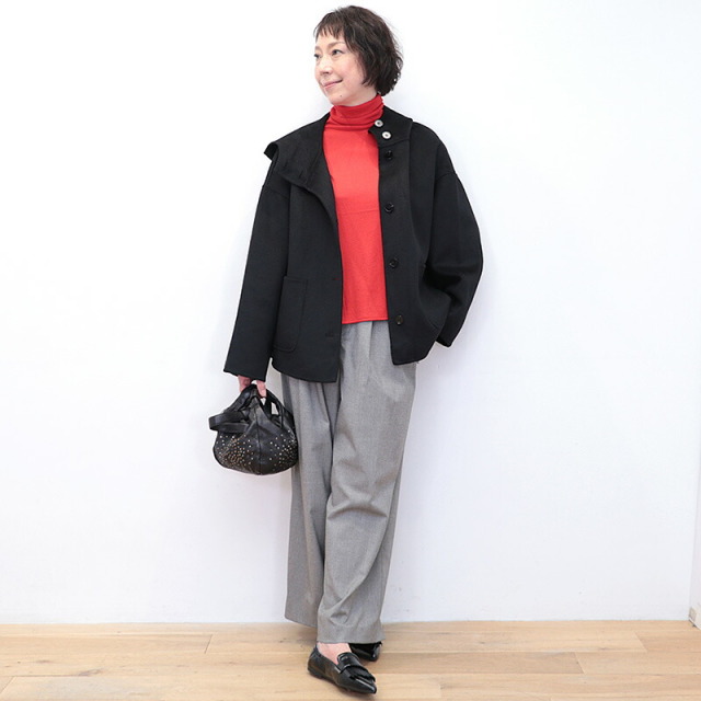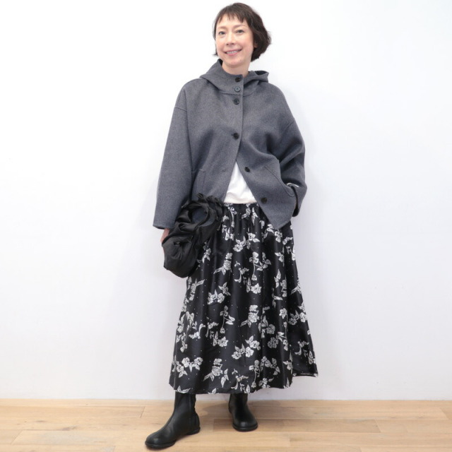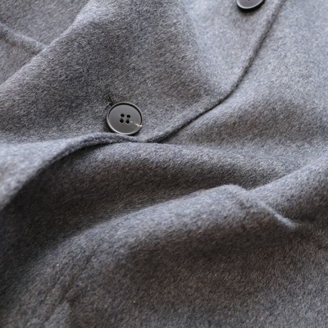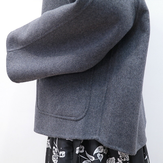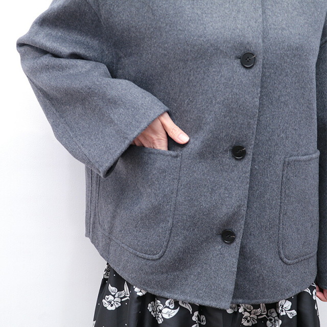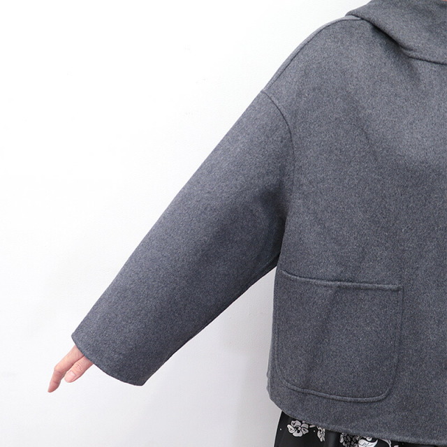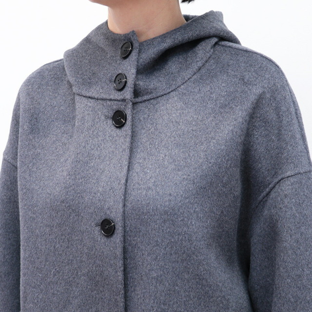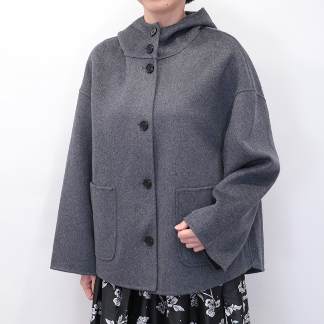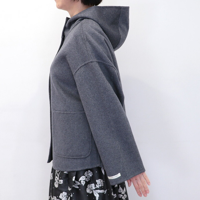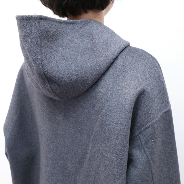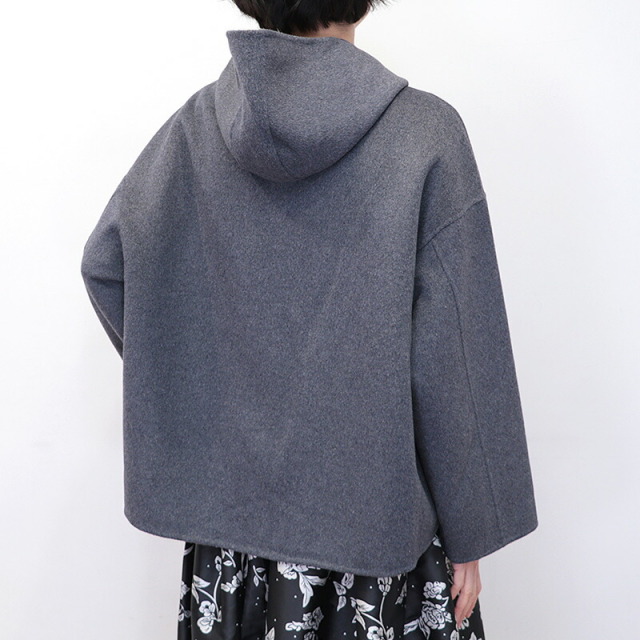 上質で滑らかなウール素材のハーフコート。裏地無しで軽快な着心地ですが、目が詰まった生地で風は通り抜けることなく、暖かく着ていただけます。さらに首元までフードの口を留めることができ、マフラーなしでも防寒対策のできる設計です。全体にゆったりとしたサイズ感で、中に着るものも選ばず、厚手のニットやドルマンスリーブのトップスも着用可能。シンプルなデザインで流行り廃りなく、どんなコーディネートにも合わせることができます。