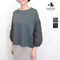 袖がリネンの布帛素材、身頃は綿のジャージ素材を組み合わせたブラウス。着心地はTシャツのリラックス感がありながら、布帛も使用することで、ブラウスのようなきちんと感も感じられます。綺麗なカーブのネックとバルーンスリーブで、丸みのある柔らかいシルエットに。蒸し暑い夏も一着で様になるプルオーバーです。同素材を使用したボトムスも販売中です。