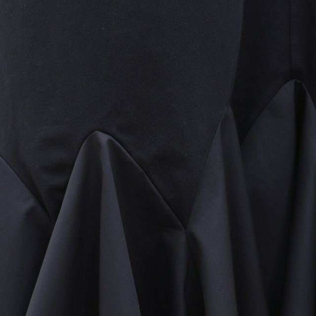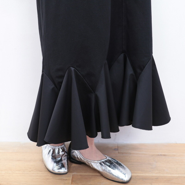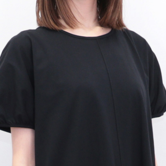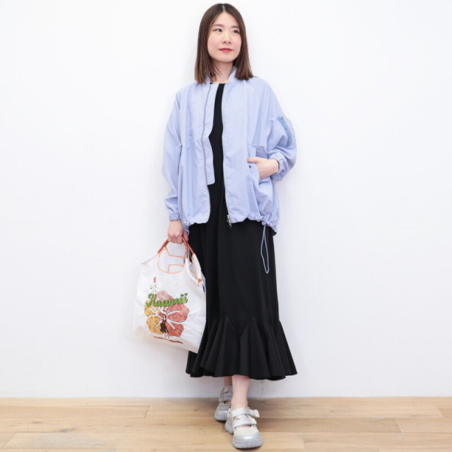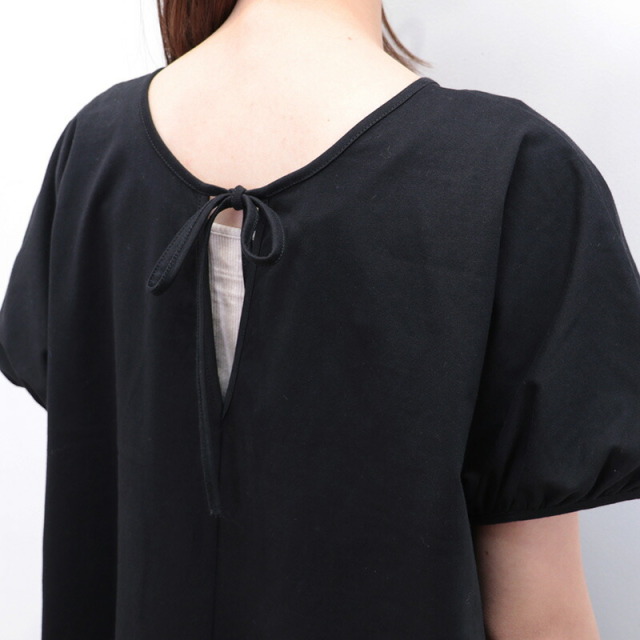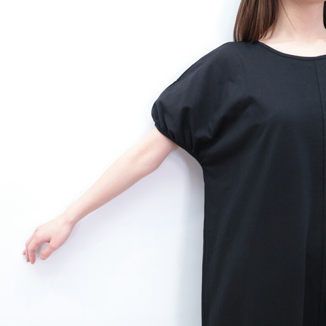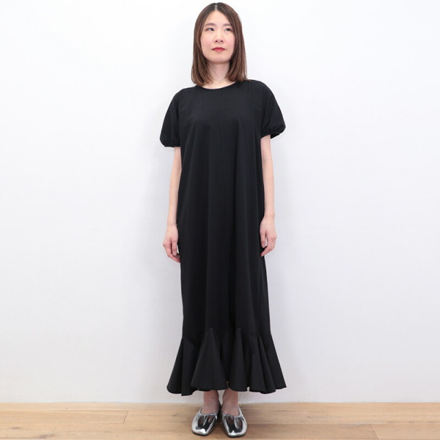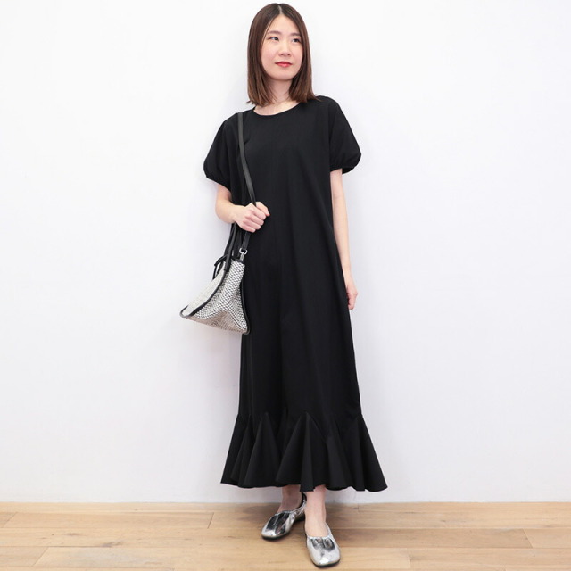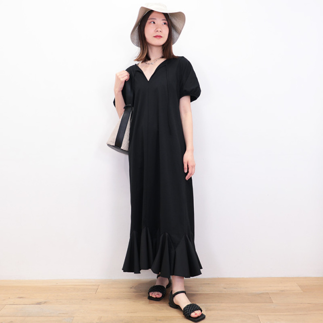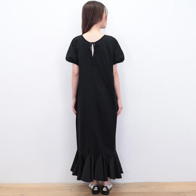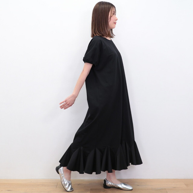 身頃と袖はコットンジャージ、裾に布帛のラッフルパーツをドッキングしたドレスライクなワンピース。立体感とボリュームのあるラッフルパーツがランダムに広がり、エレガントなマーメイドシルエットに見せてくれます。控え目なパフスリーブと首後ろのリボンがさりげなくアクセント。ベースがTシャツ素材なので着心地はリラックス感が有り、見た目は一枚で華やか。前後逆に着用することも可能。Vネックの方では涼しさとリゾート感がアップします。ちょっとした外出から長時間の旅行まで、どんなシーンもノンストレスで対応できるマルチなアイテムです。