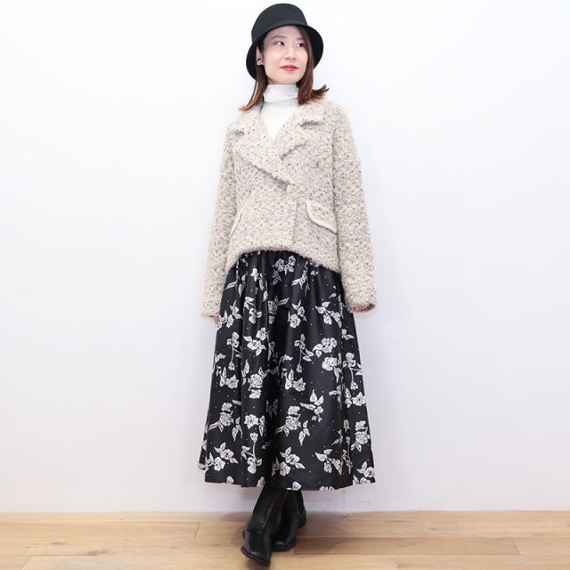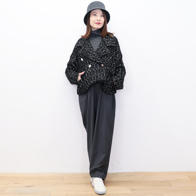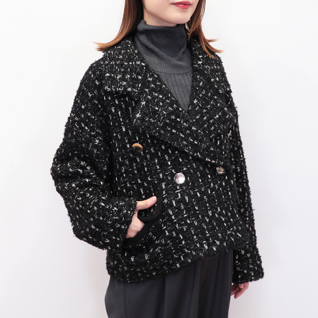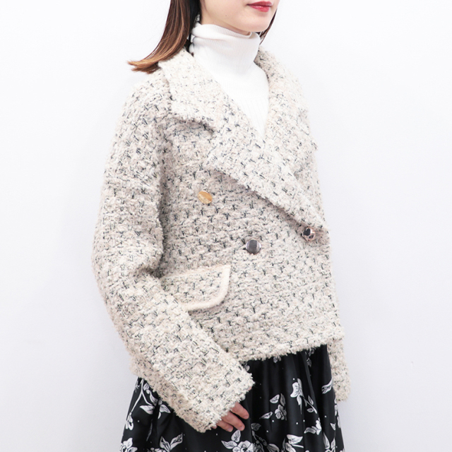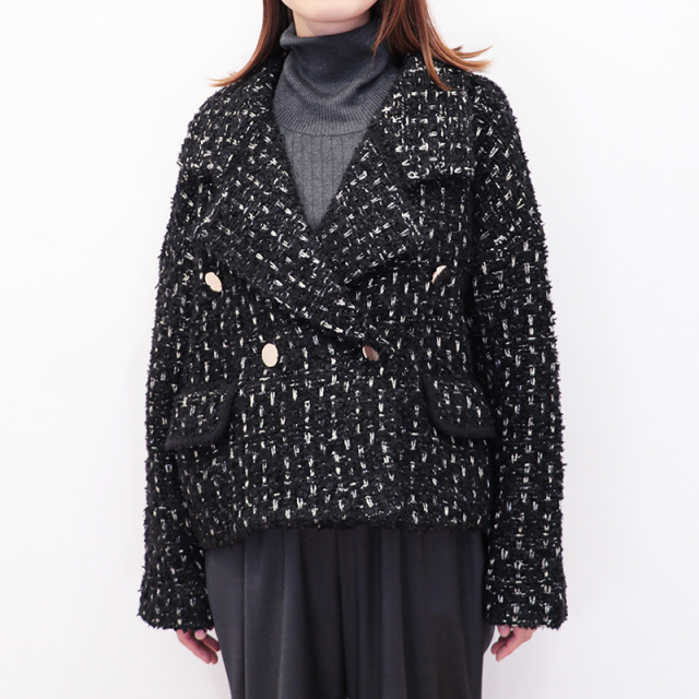 ふっくらとした太目の糸で編まれた、ツイードのような素材感のあるニットジャケット。 メタリックの糸やテープなど異なる素材感がミックスされたような華やかさ特徴的です。ボリュームのある見た目に反して軽い着心地。アウターよりもニットカーディガンの感覚でリラックスして着用いただけます。オケージョンシーンにもおすすめです。