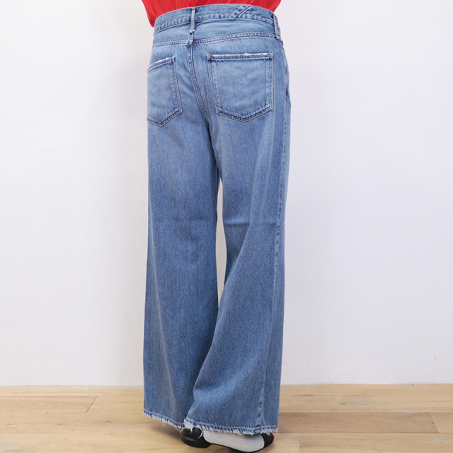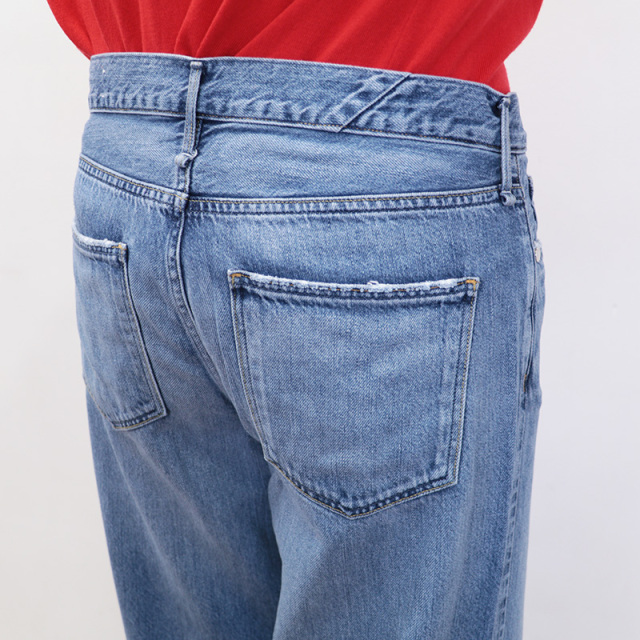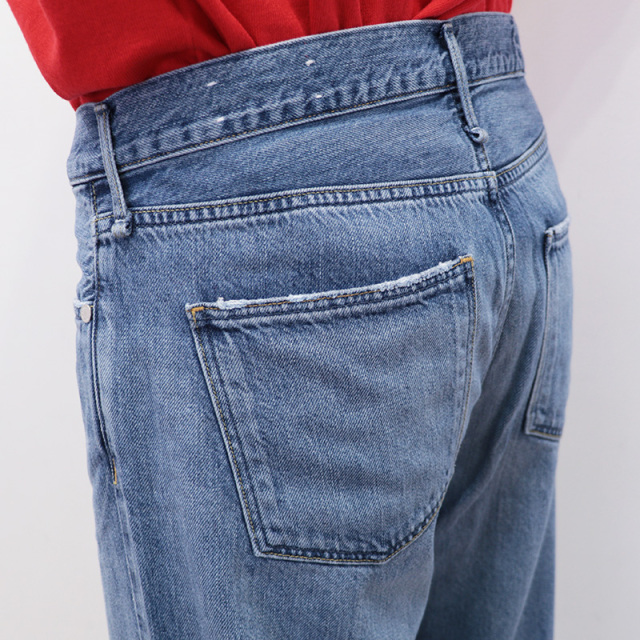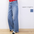 デニムらしいシボ感がありつつも、軽やかで柔らかいリヨセル混のupper hightsオリジナル素材を採用した軽い着心地の春デニム。 緯糸にオープンエンド糸を使用することで、肌に当たる面は清涼感のあるドライなタッチを実現しています。全体的にゆるっとしたシルエットと、ミドルライズでラフに穿ける一枚。春コーデのベースに活躍間違いなしです。
