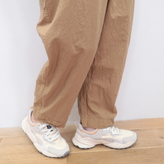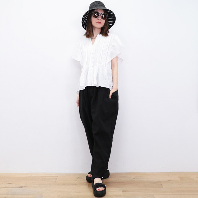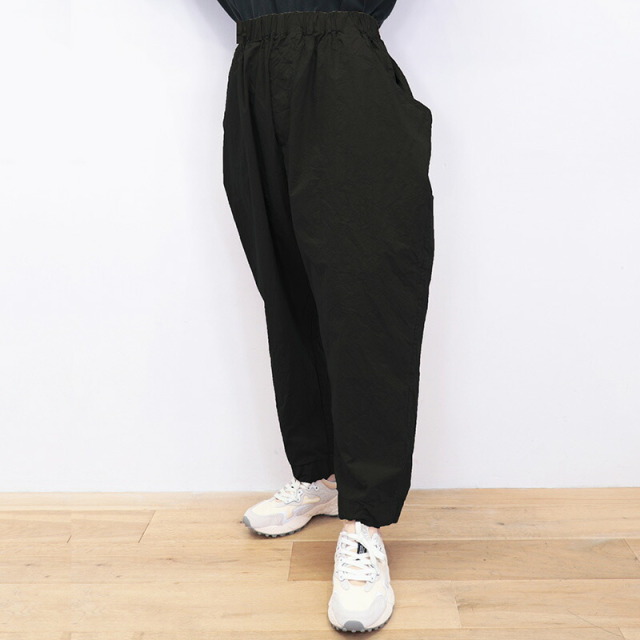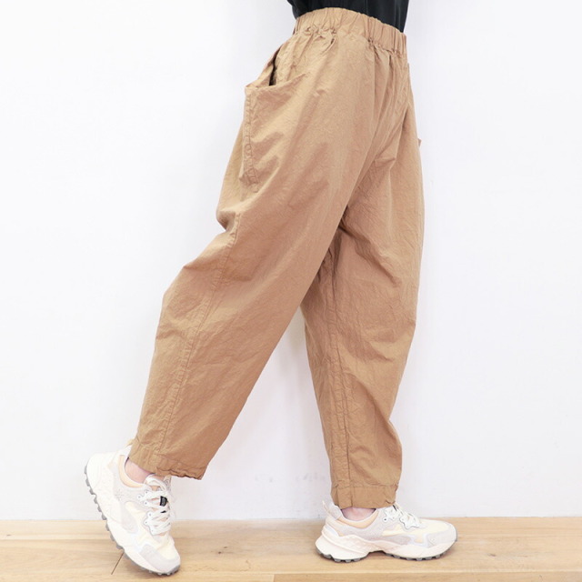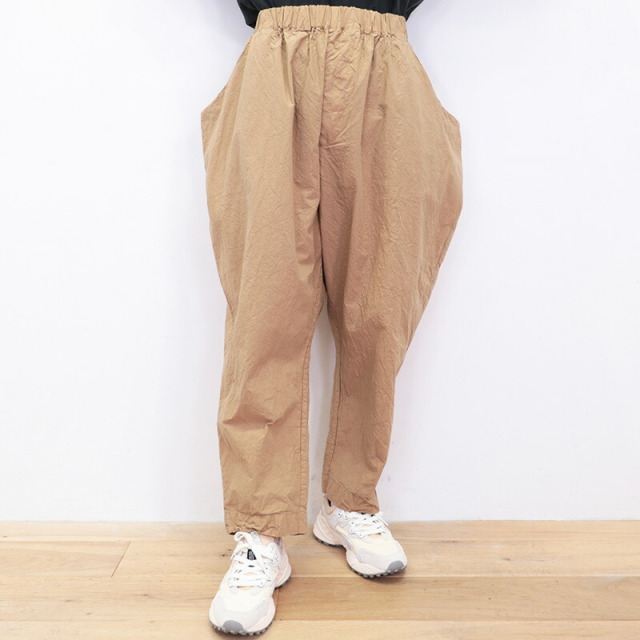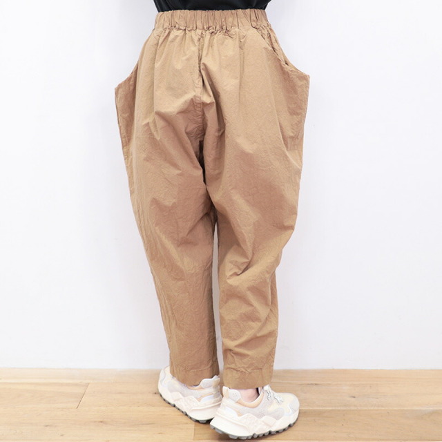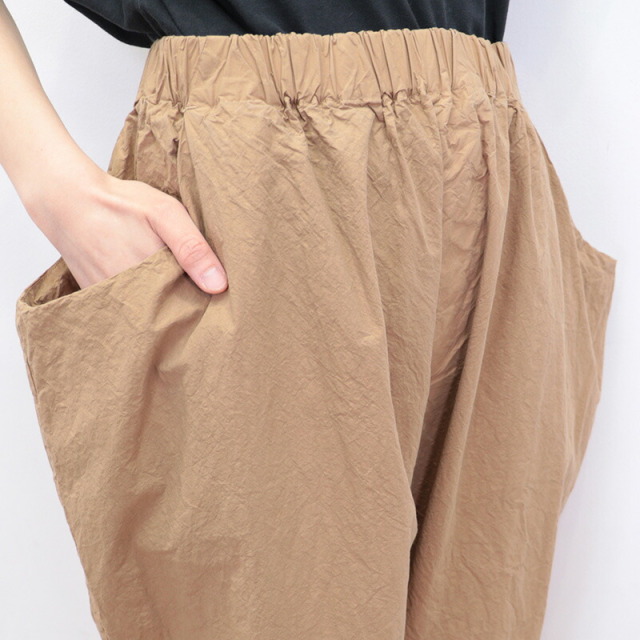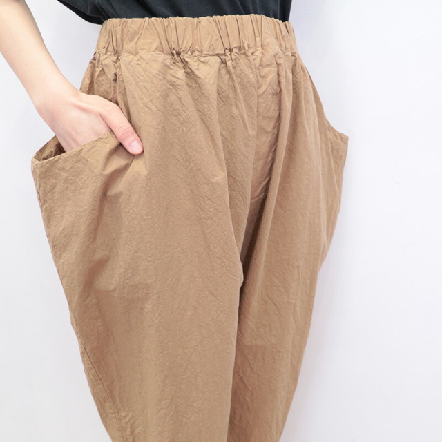 ウエストの切り替えを利用した大きなサイドポケットがデザインの一部となっているユニークなパンツ。ゆとりのある腰回りから、裾に掛けて細くなるテーパードシルエットです。ウエストはゴム+紐によるイージー仕様。薄手のコットンタイプライター生地を使用し、真夏も軽快でドライな穿き心地。製品染めにより随所にパッカリング(シワ)が起こり、ニュアンスのあるカジュアルな表情に仕上がっています。