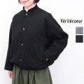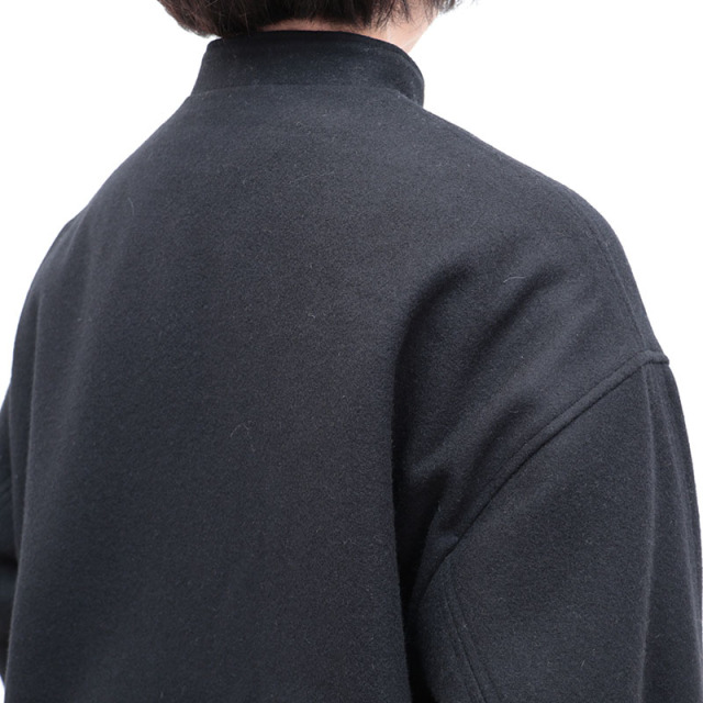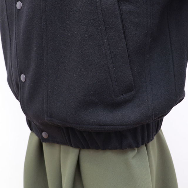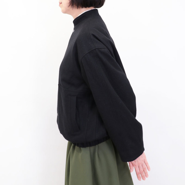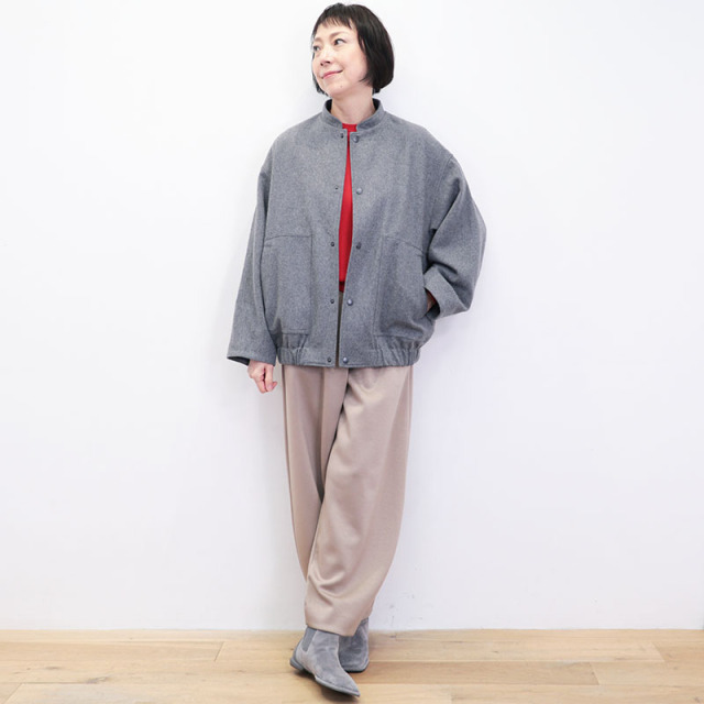 スタンドカラーのブルゾン。ゆとりのあるボックスシルエットです。ゴムを効かせた裾や、ドットボタンの前開きによりカジュアルなデザインに仕上げています。大阪府の泉大津にある、創業100年以上続く老舗企業により、リサイクルウールを主原料につくられた圧縮フラノ素材を採用しました。中肉素材で適度なハリがあり、軽い着心地が魅力。目の詰まった圧縮ウールは風を通さず保温性抜群です。カーディガン感覚でさっと羽織れて日常使いに重宝します。コットン素材の裏地付きで肌当たりも快適になっています。