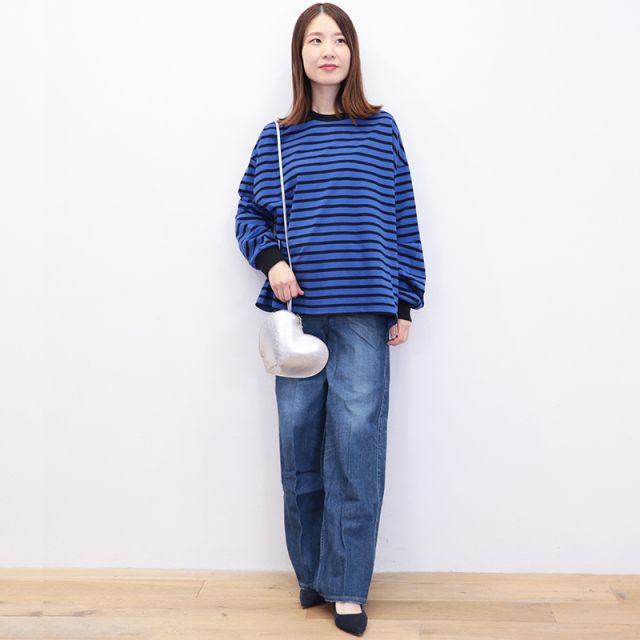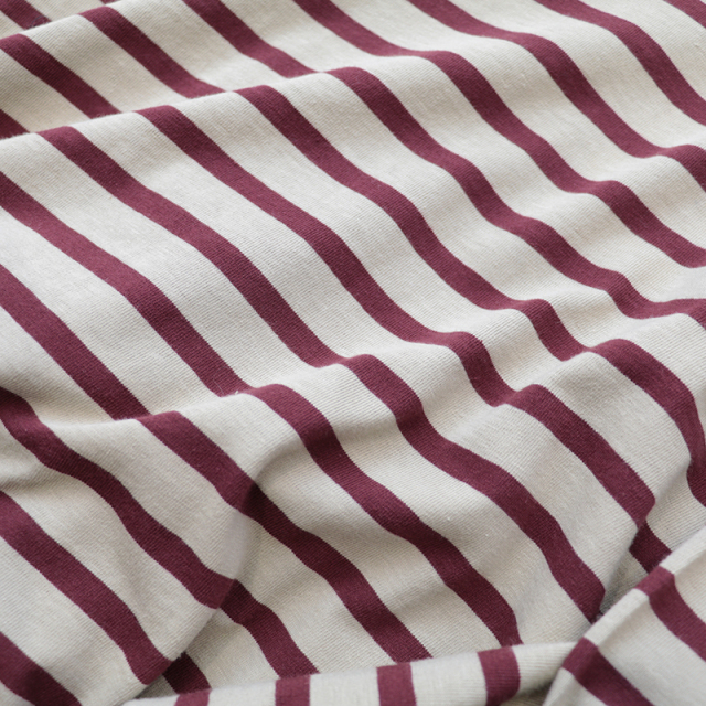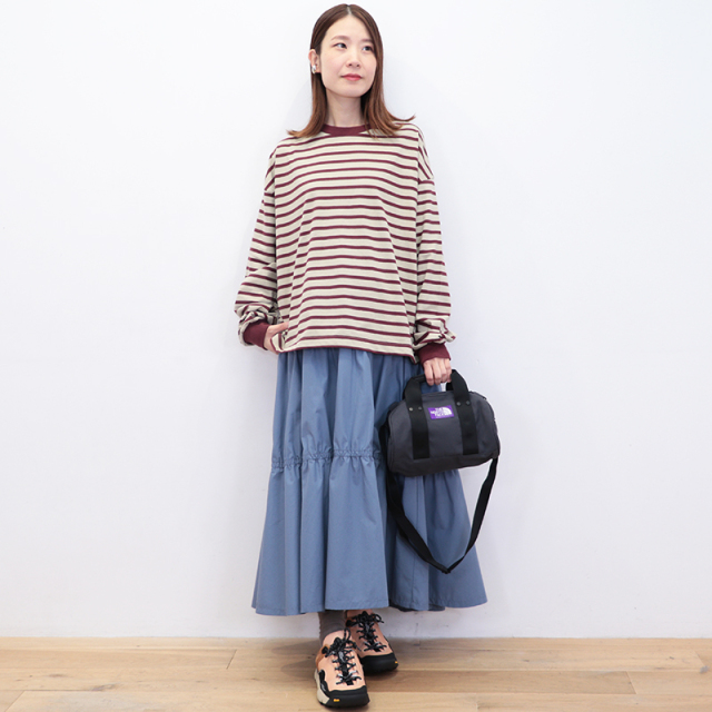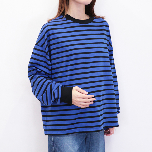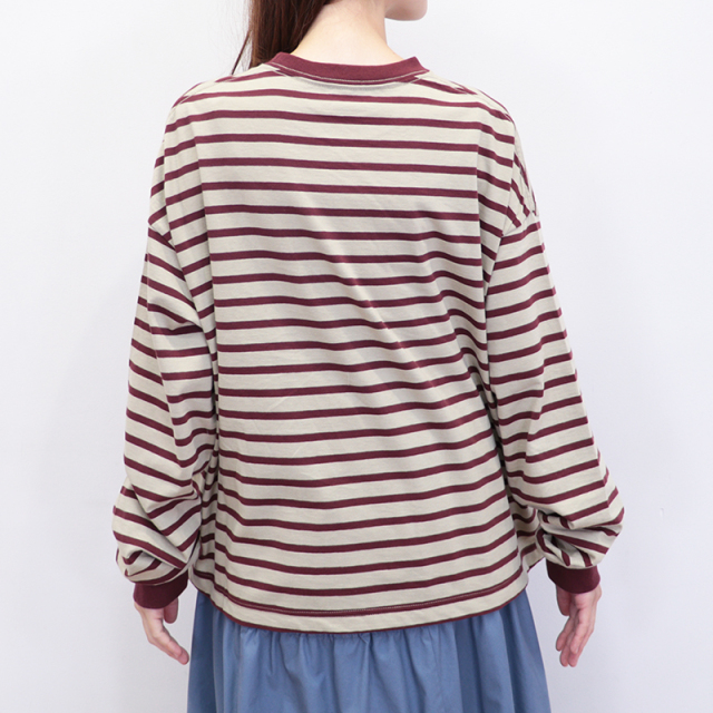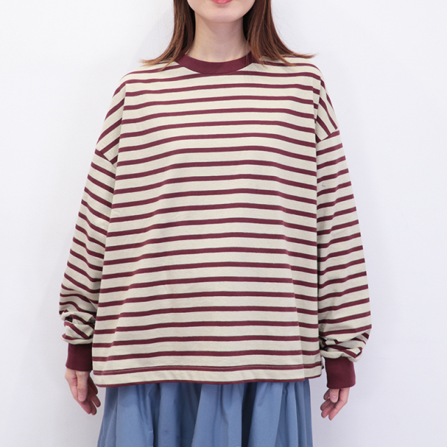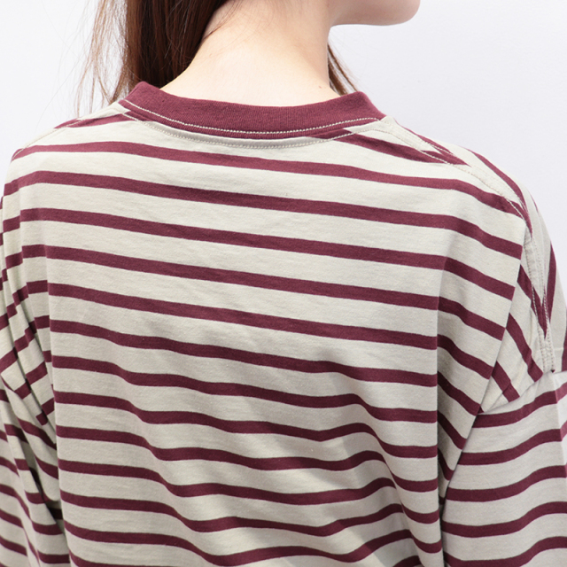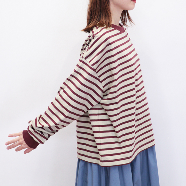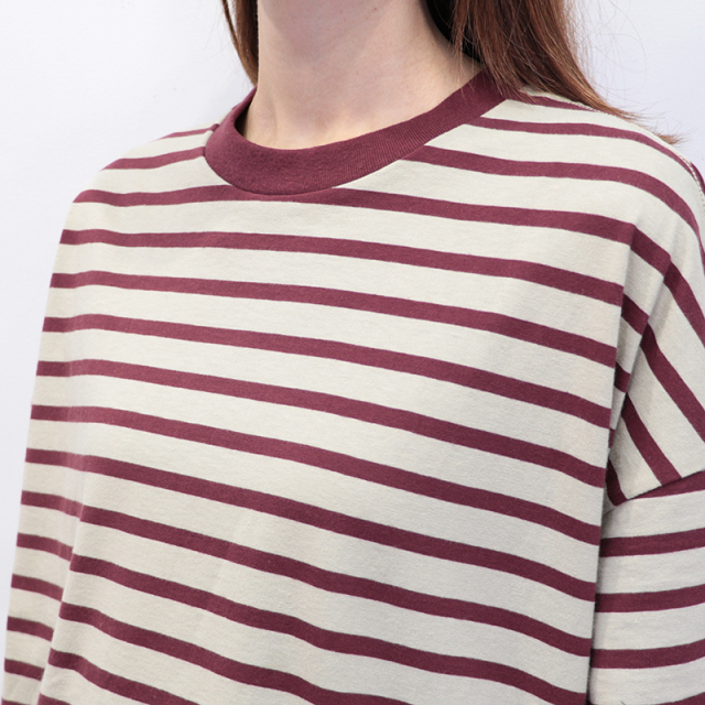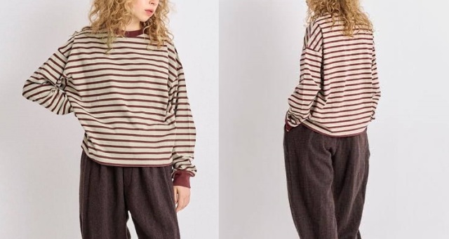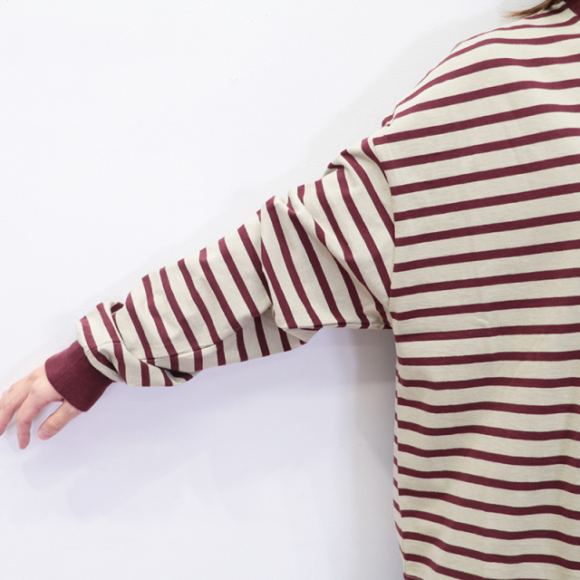 秋冬を感じる配色ボーダーロンT。メキシコ産のタコスコットンを使い、先染めのボーダー柄を少し目を詰めて、丁寧に編み上げています。糸にはふっくらとしたふくらみがあり、やさしい風合いが魅力。 ほどよい厚みとハリ感があるので、型くずれしにくく、きれいなシルエットをキープしてくれます。 程良い肉感と、絶妙なサイズ感、首周りと袖口の配色がポイントになり、一枚で様になります。サロぺットやニット、ベストの合間からちらっと見せるのも上級者。暗くなりがちな秋冬のコーデにカラーをプラスしてくれるアイテムです。