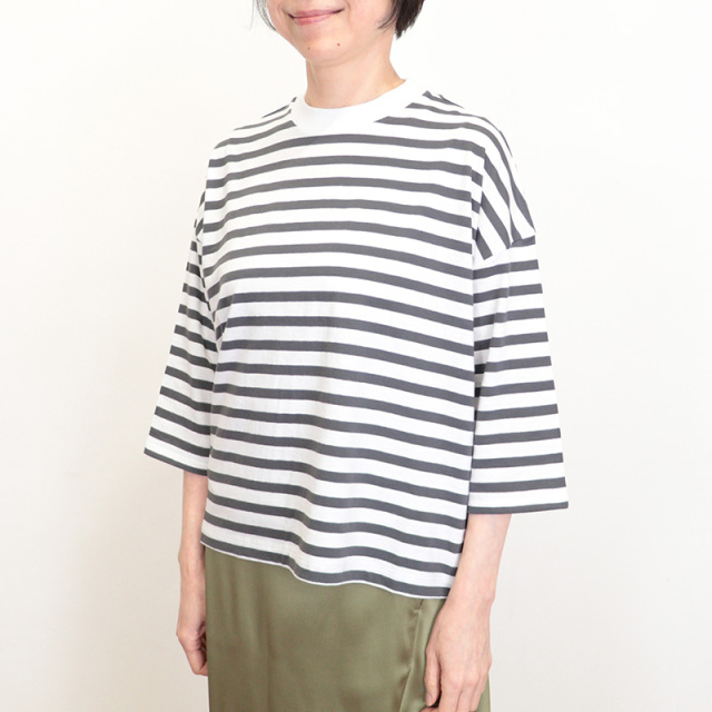 ドロップショルダー・ワイドめなシルエットにより、一枚で様になるボーダーTシャツ。リラックス感がありながら、ネックはフライス使いにしきちんとした印象に仕上げました。膨らみがあり耐久性の強いテキサス綿と、しなやかな肌触りのスーピマ綿の2種をブレンドした糸で編み立てられたVeritecoeurオリジナル素材です。春コーデに爽やかさをプラスしてくれるアイテムです。