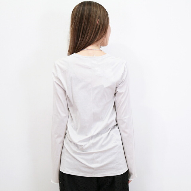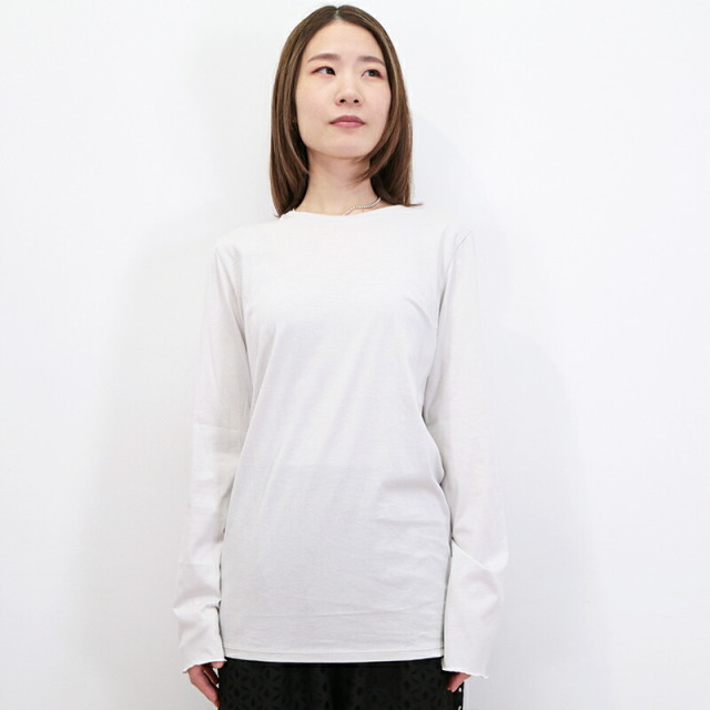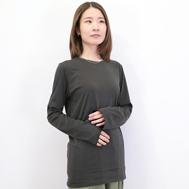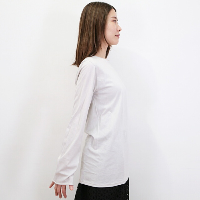 大人気の定番ロングスリーブカットソー。袖周りの程よい緩さのあるサイズ感がポイントで、レイヤードした時のバランスはもちろんシンプルながらも1枚で様になるバランスです。合わせやすく、何枚あっても重宝するベーシックトップス。素材にはオーガニック長超綿をハイゲージで編み立てた天竺素材を使用しています。オーガニック長超綿は非常に希少で、特殊紡績することで毛羽の少ない柔らかな糸へと仕上げています。糸の良さをより引き立てる為に加工にも研究を重ねて風合い出ししており、艶やかで美しく、程よく張りがあるので体のラインを自然にカバーしてくれます。