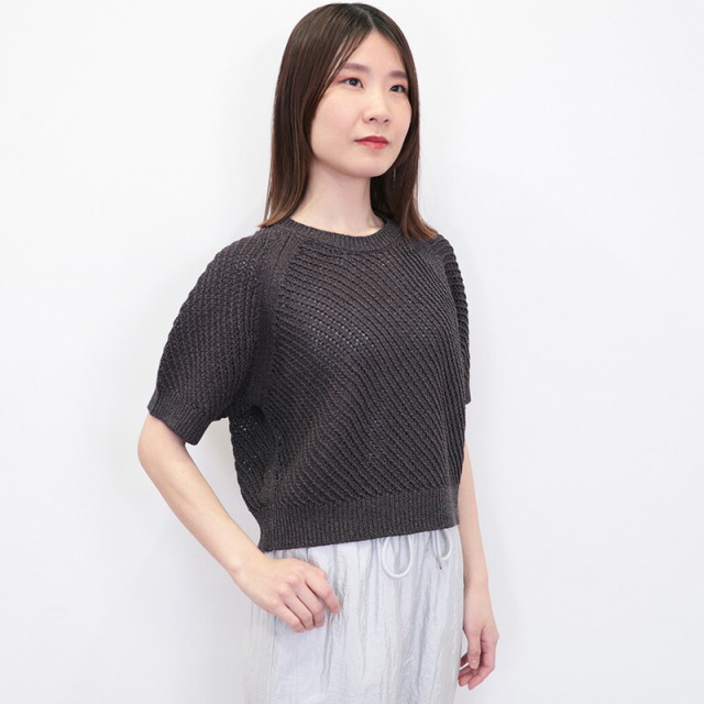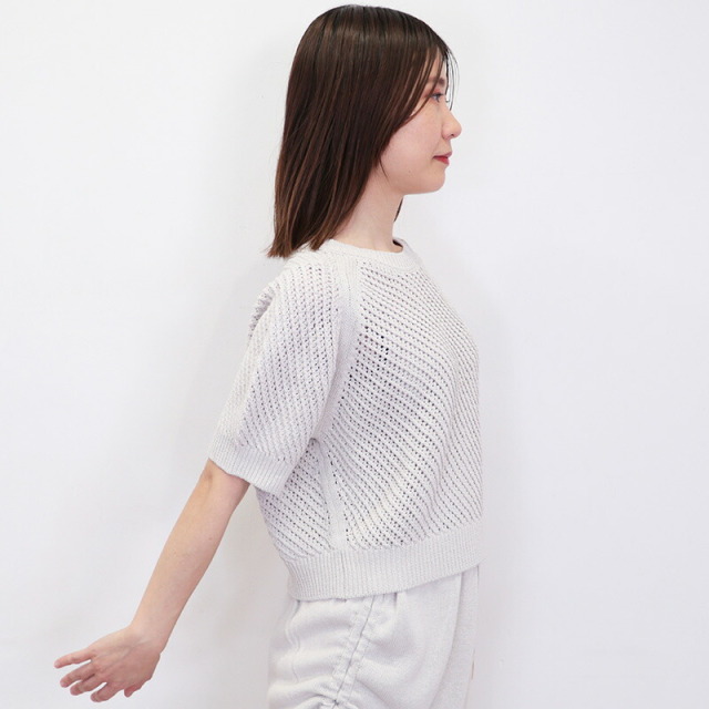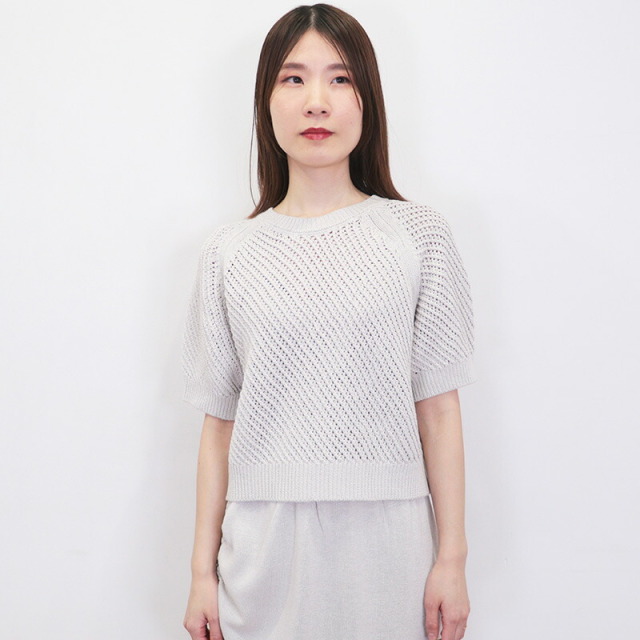 コンパクトなシルエット、やや長めの袖丈でクリーンな印象に仕上げたメッシュ二ット。ラグランスリーブなので、動きやすくストレスフリーで着用いただけます。糸には、ドライな感触を出すために和紙をブレンド。和紙の中でも高級原料のマニラ麻を使用した美濃和紙糸と、コットン・レーヨンを交撚した素材です。非常に軽くて張りコシがあり、さらっとした爽やかなタッチで通気性に優れています。ニュアンスのある絶妙なカラーも季節の変わり目にコーディネートしやすいポイントです。