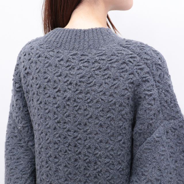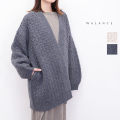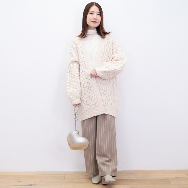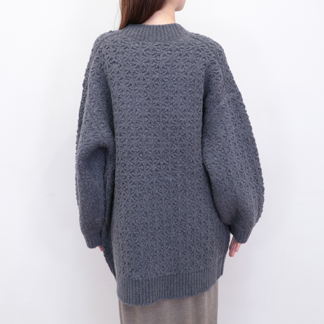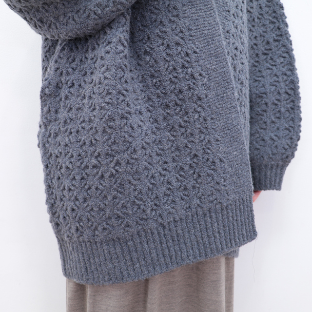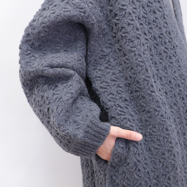 かぎ針のような編地が特徴のカーディガン。ボリュームのあるスリーブとゆとりのあるサイズ感のミドル丈で、ゆったりと羽織っていただけます。 雪の結晶のような、奥行きのある繊細な編地が目を引きます。表裏で素材を変え、表はブークレ調の不規則な糸でかぎ針のような透かし柄に、裏は軽くて暖かなアルパカ混の素材を使いダブルフェイスのように仕立てたこだわりのディティール。 ざっくりとしたニットらしい雰囲気と、二重構造のボリュームで着心地もデザインも暖かみを感じられます。