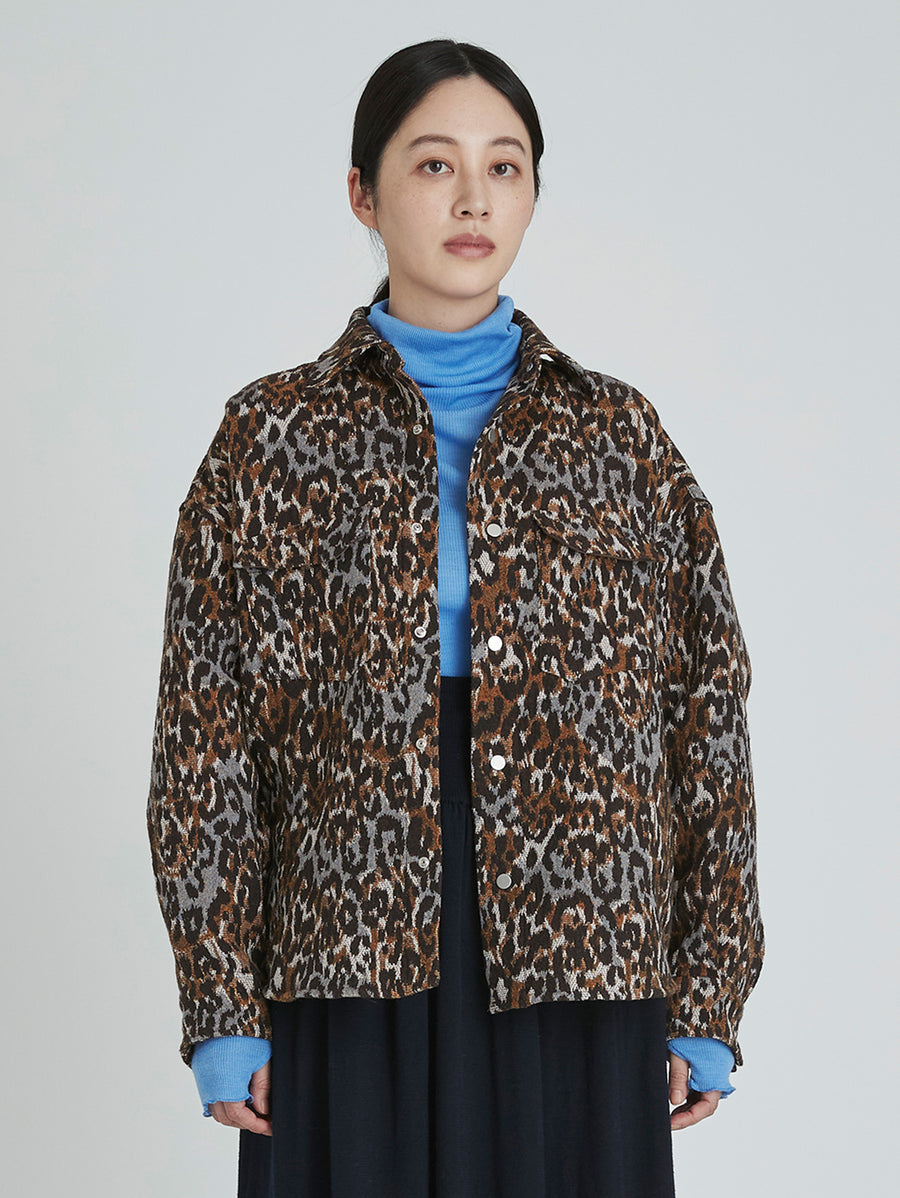 カジュアルなオーバーシャツをキャッチーで華のあるレオパード柄のジャガード生地でシャツジャケットにデザイン。