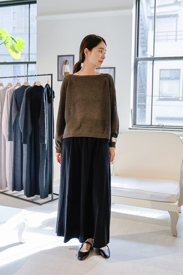 ボートネックがデコルテを綺麗に見せ、ゆったりとしたシルエットが女性らしい柔らかな抜け感を演出、オーバーシルエットが、気になるラインをカバーしつつ旬な佇まいを叶えます。