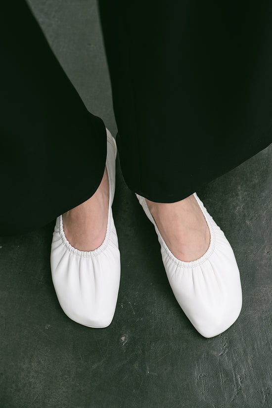 スクエアとラウンドの要素を持ったオブリークトゥは、甘くなりすぎない大人のためのバレエシューズを目指しました。どんなボトムスにも合わせやすいデザインで、通年ご着用いただけます。